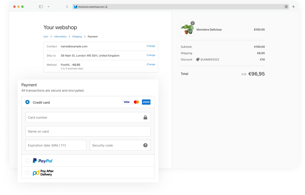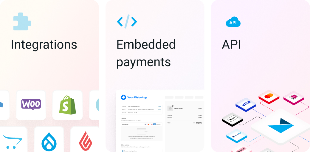 Offer best-in-class checkout experience to your clients. Use our in-house developed integrations for the major e-commerce platforms like WooCommerce, Magento, Prestashop and others, SaaS platforms like Shopify, Lightspeed, CCV, and others, our API, Javascript libraries, GraphQL, PWA, or even pay-by-link or QR codes. Integrations that easily configured, maintained, and deployed. Offer the full suite of MultiSafepay capabilities today.